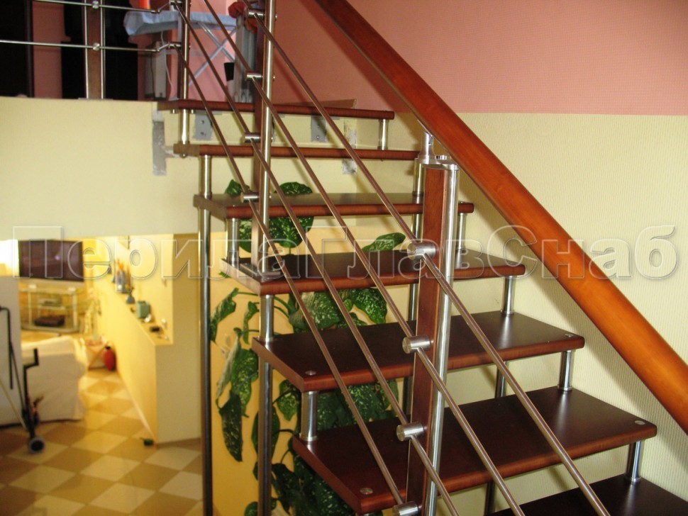 Нержавеющие ограждения без ригелей с круглым поручнем и стойками с деревянными вставками