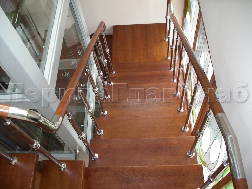 Нержавеющие ограждения без ригелей с круглым деревянным поручнем и стойками с деревянными вставками