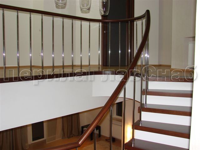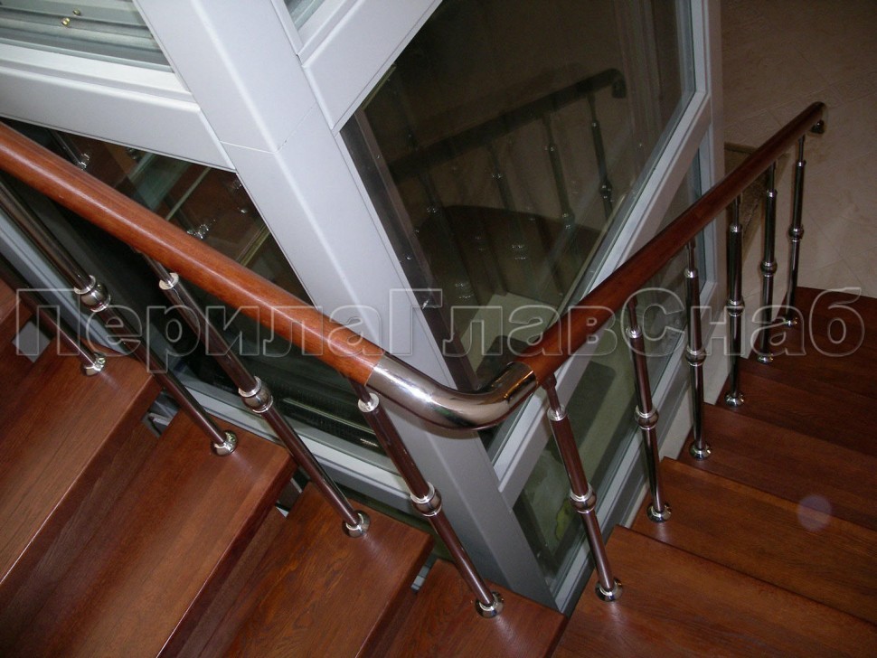Нержавеющие ограждения без ригелей с круглым поручнем и стойками с деревянными вставками