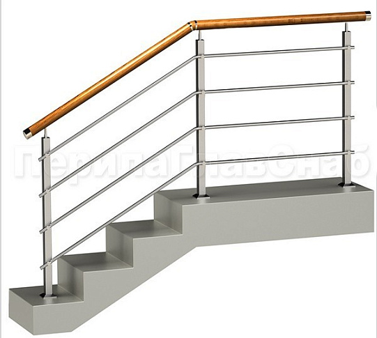 Четыре ригеля на держателях, круглый деревянный поручень и квадратные стойки