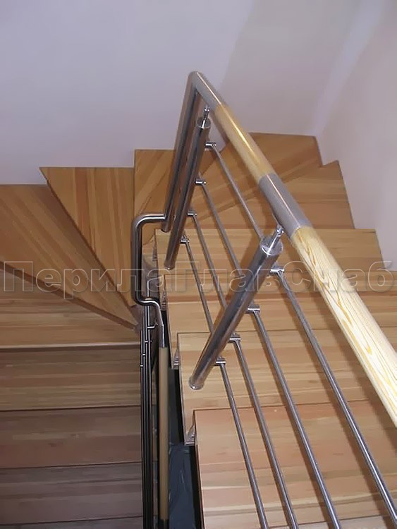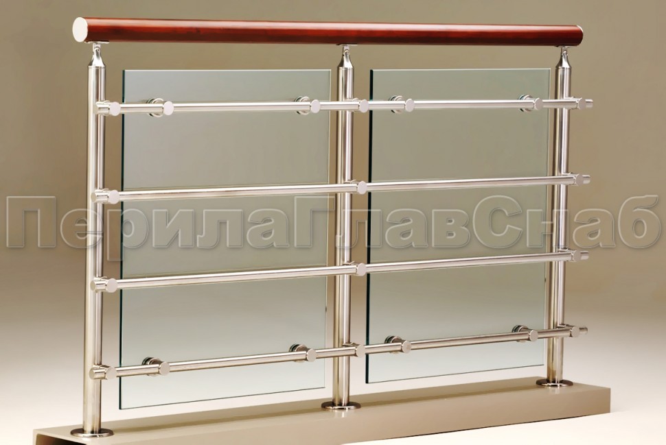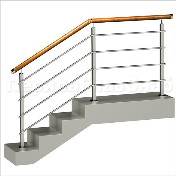 Четыре ригеля на держателях, круглый деревянный поручень и квадратные стойки