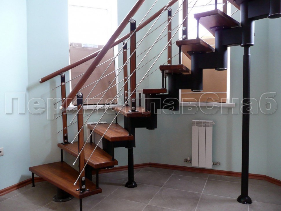 Четыре ригеля на держателях, квадратный деревянный поручень и квадратные стойки
