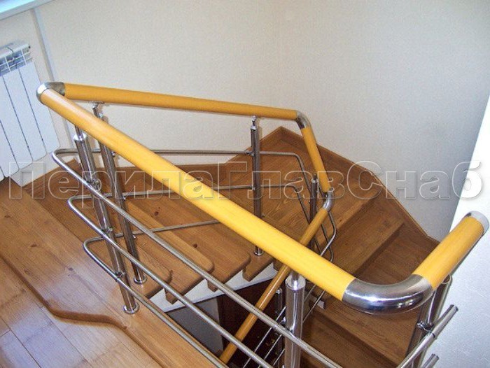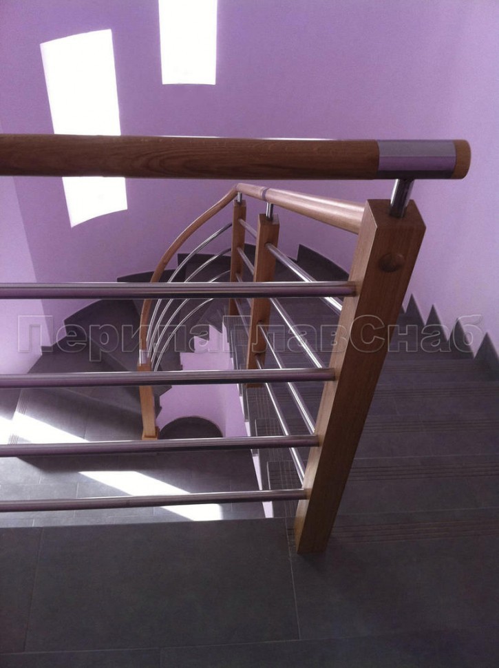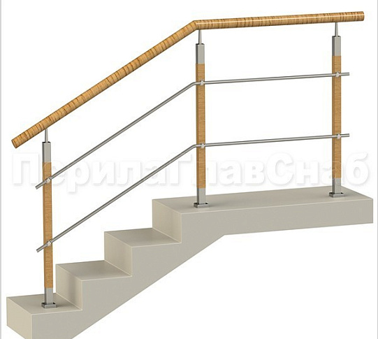 Три ригеля на сварке, квадратный деревянный поручень и круглые стойки
