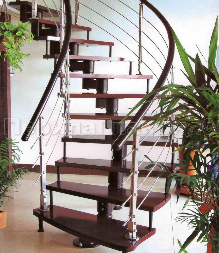 Ограждения со стойками в каждую ступень с круглым деревянным поручнем без ригелей