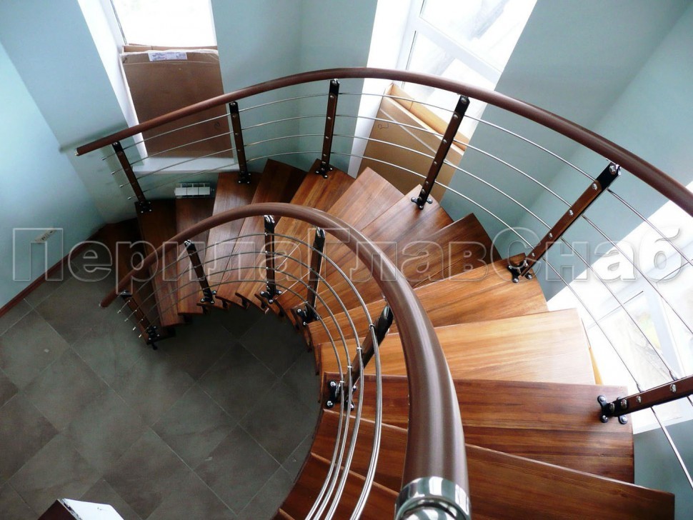 Нержавеющие ограждения без ригелей с круглым деревянным поручнем и стойками с деревянными вставками