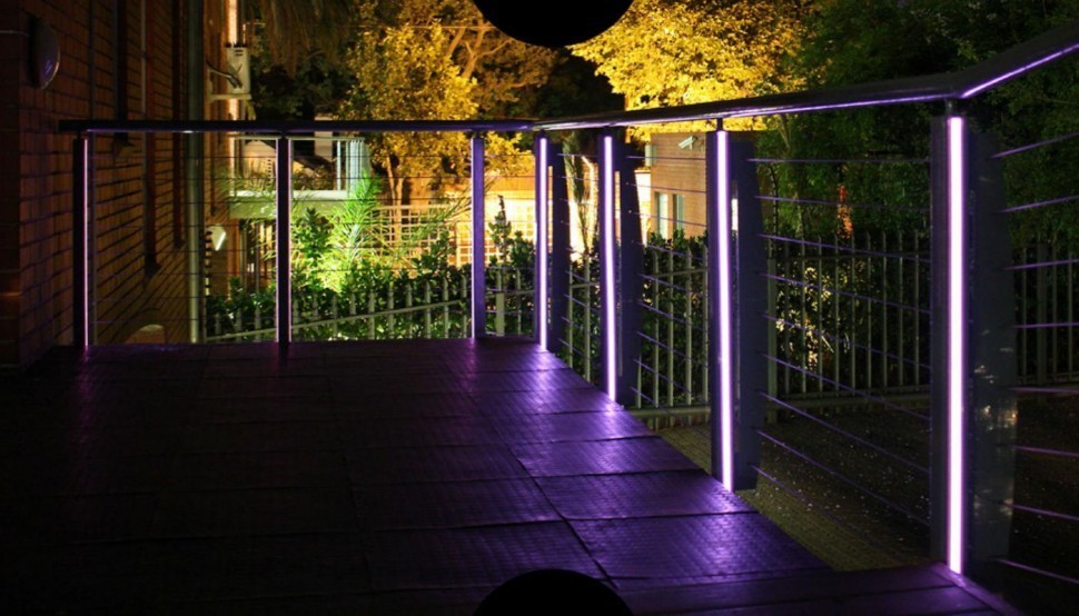 Наиболее эффектно смотрится одновременно два вида подсветки: подсветка поручня и подсветка стоек.