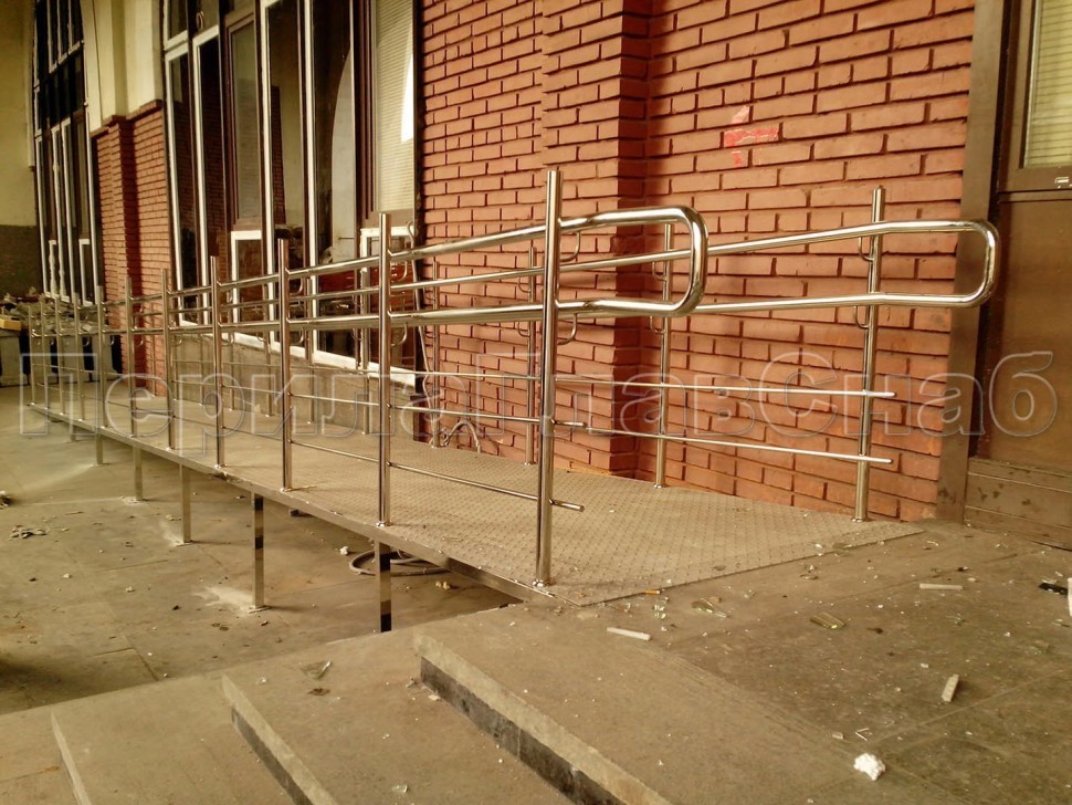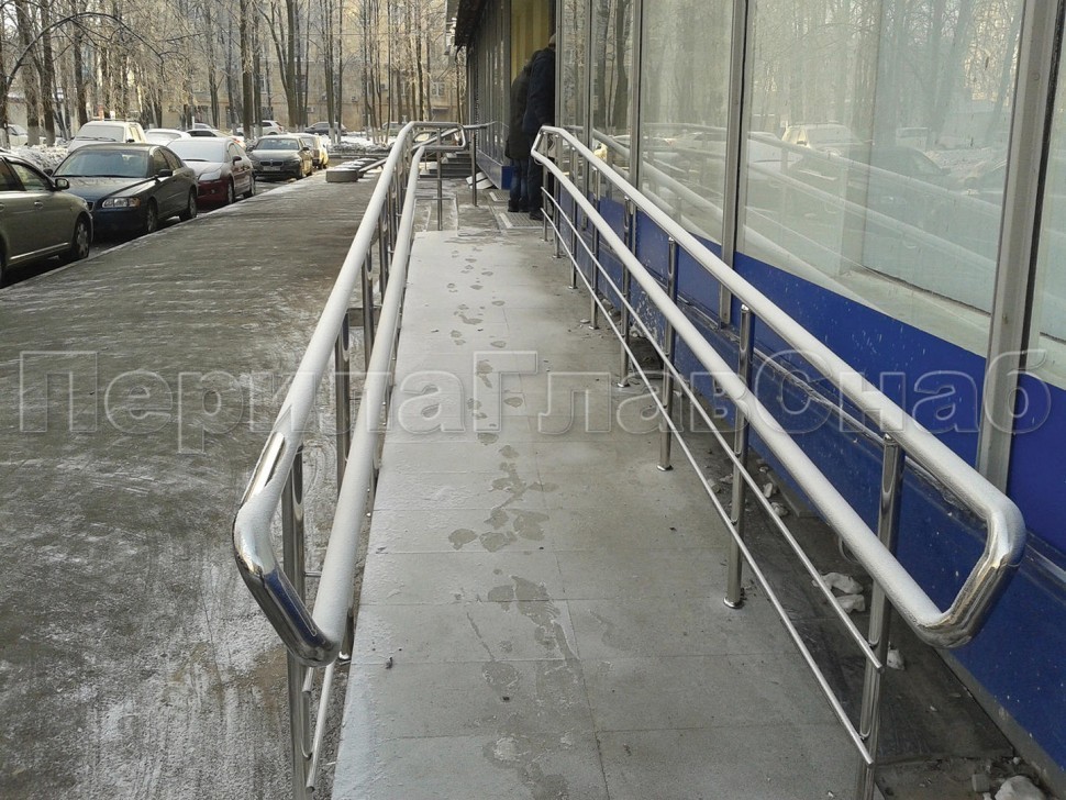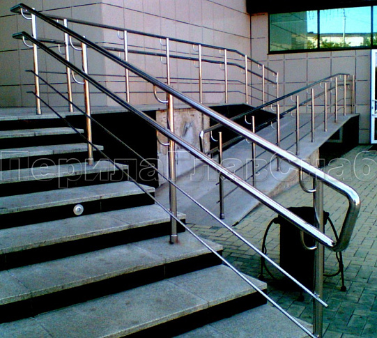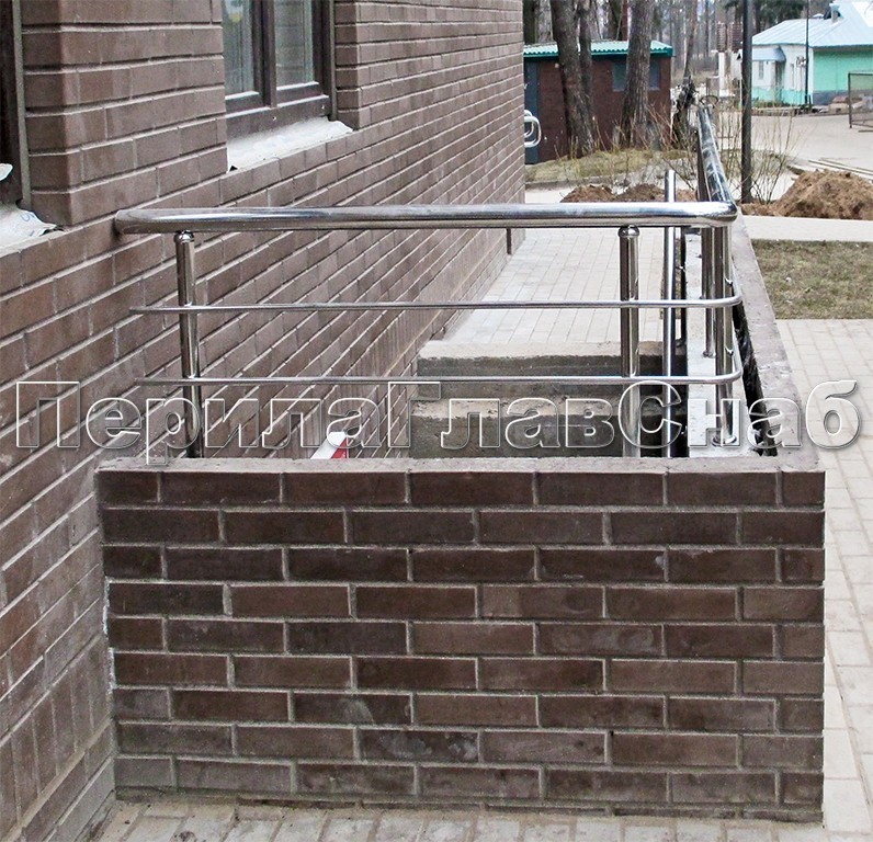 сдвоенный, из круглой нержавеющей трубы диаметром 38,1 мм. Нижний и верхний поручни завязаны при помощи отводов. Поручень может крепиться на выносные держатели.