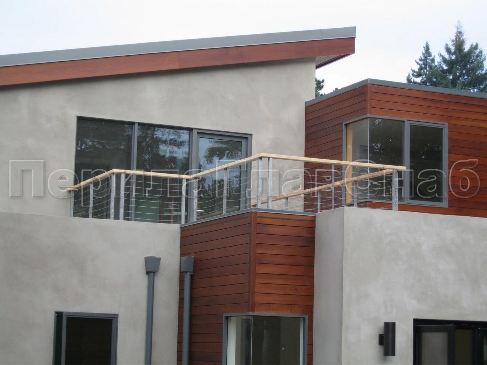 Нержавеющие ограждения без ригелей с круглым деревянным поручнем и стойками с деревянными вставками