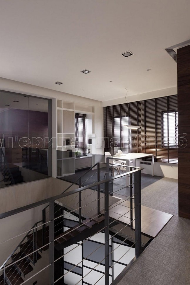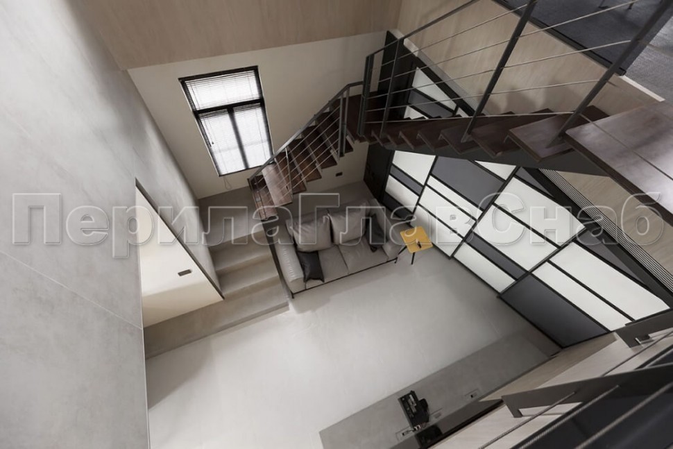 Ограждение лестницы со стеклом, тонированным в массе, стойки и завязки поручня из латуни