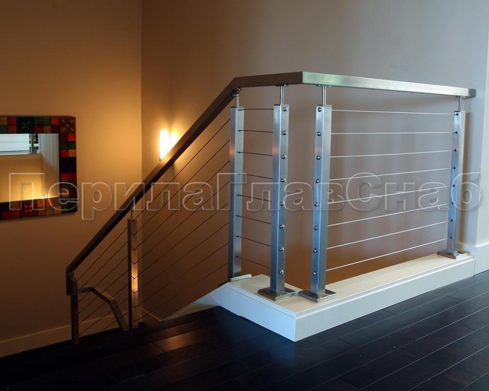 Ограждения из нержавейки. Заполнение из 2х тросиков. Квадратные стойки