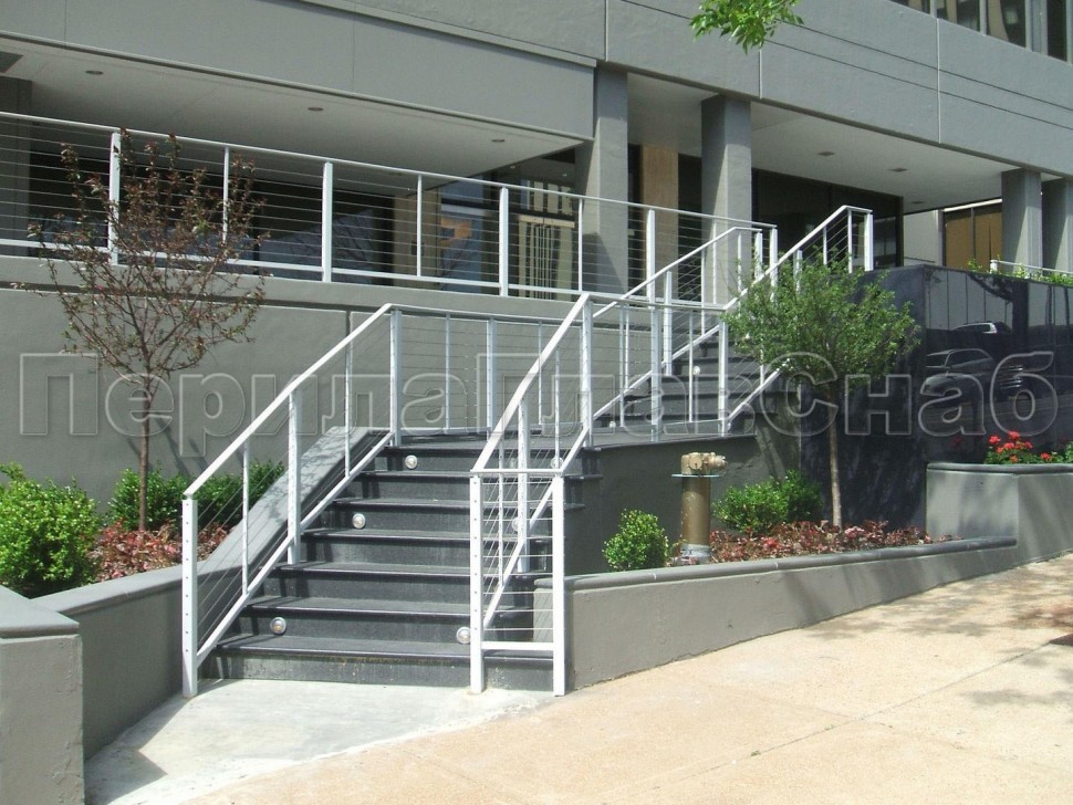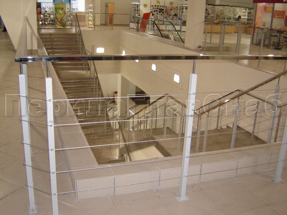 Ограждения из нержавейки. Заполнение из 2х тросиков. Квадратные стойки