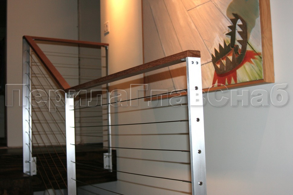Четыре ригеля на держателях, квадратный деревянный поручень и квадратные стойки