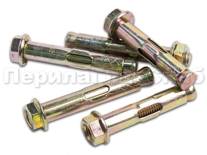 Анкер болт с гайкой представляет собой сложное крепежное изделие, которое состоит из втулки(внешней оболочки), шпильки с распором с конусом на конце и гайки-прокладки с запрессованной шайбой. При монтаже анкерного болта с гайкой, шпилька выступает за края анкера, и увеличивает его общую длину, а при закручивании гайки, шпилька с распором перемещается в сторону гайки, расклинивая втулку (внешнюю оболочку), которая и упирается в стенки отверстия, обеспечивая надежность крепления.