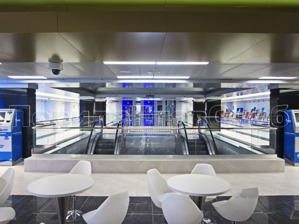 На этом же объекте на перилах для лестниц в качестве поручня установлена труба с пазом с подсветкой.