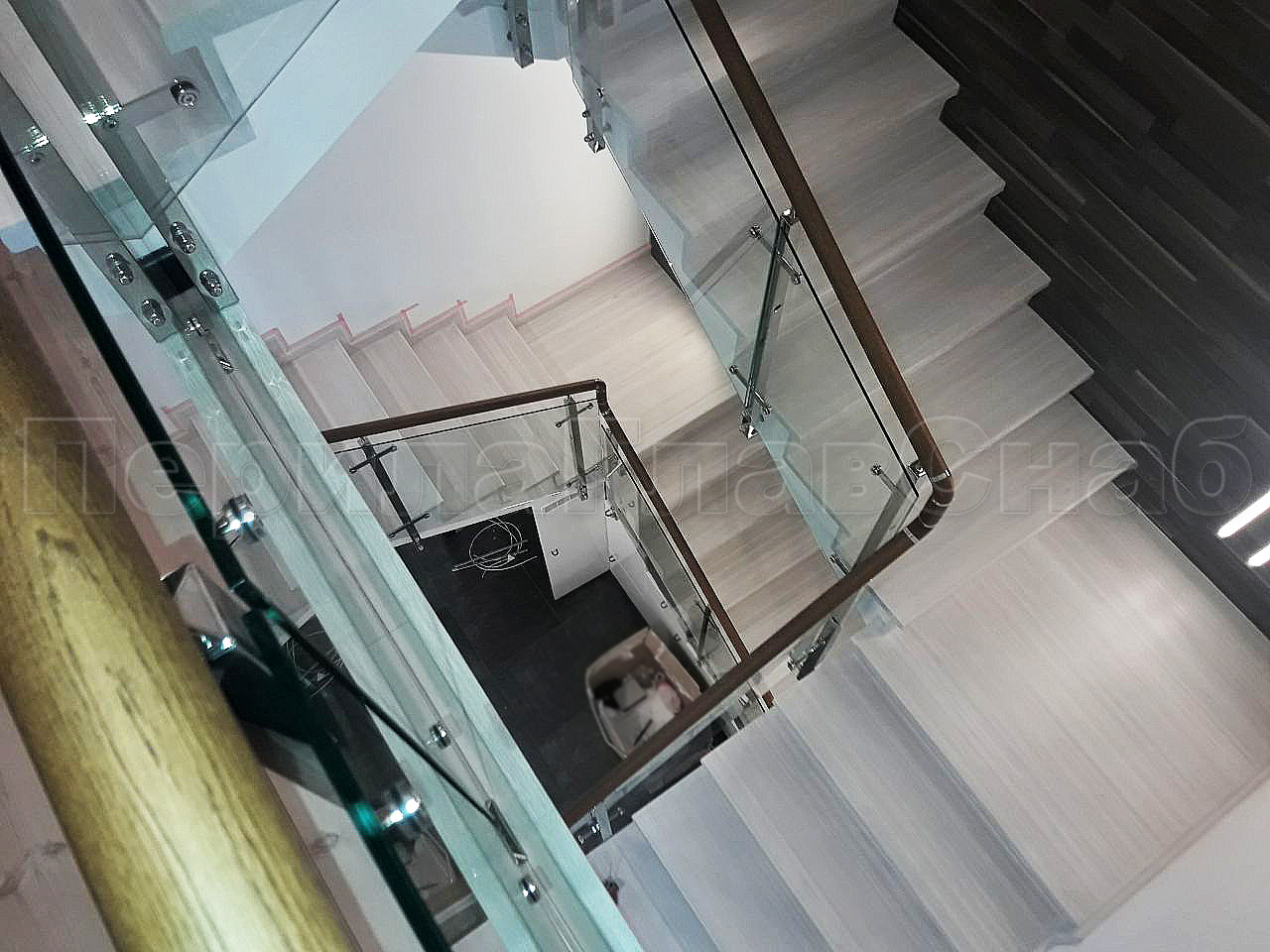 Ограждение лестницы с квадратными стойками и пластинчатыми стеклодержателями в Самаре. Готовые проекты ПерилаГлавСнаб