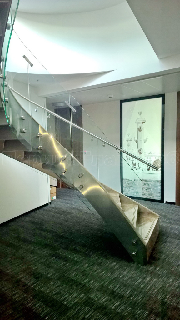 Цельностеклянные ограждения для забежных лестниц с дополнительным поручнем
