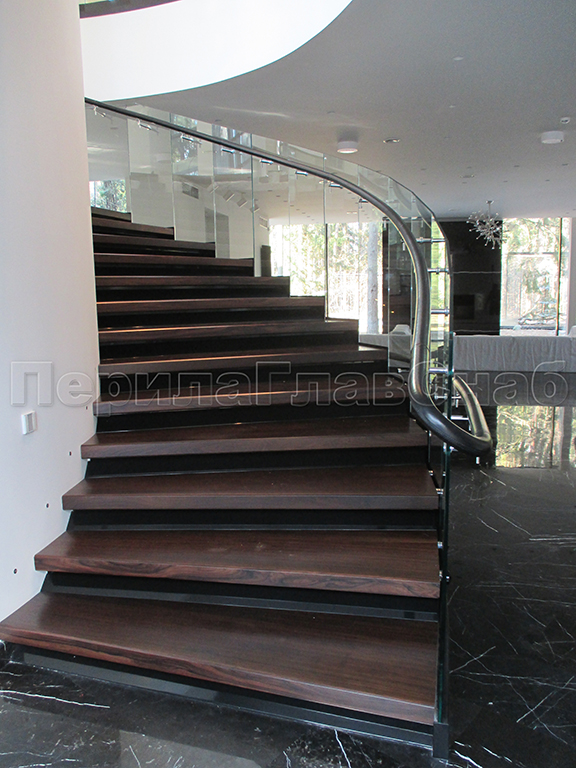 Примеры цельностеклянных ограждений на забежных лестницах: