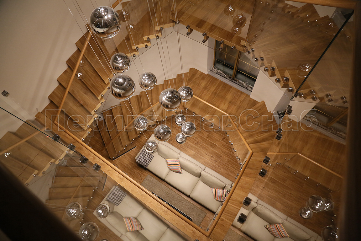 Стеклянные перила на забежной лестнице в современном коттедже в Подмосковье