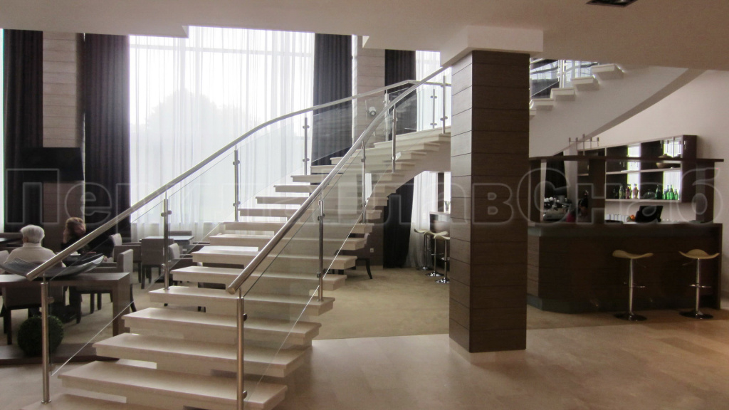 Описание: Заказчик поставил задачу установить надежные, удароустойчивые ограждения в офисный центр. Плюс требовалось подчеркнуть респектабельность и успешность проекта. Ограждения устанавливались в полностью подготовленный интерьер с мраморной плиткой. Сроки были очень сжаты, заказчик торопился со сдачей проекта. Наш отдел проектирования предложил следующее решение: ограждения на несущем стекле с креплением на анодированный профиль. Характеристики: