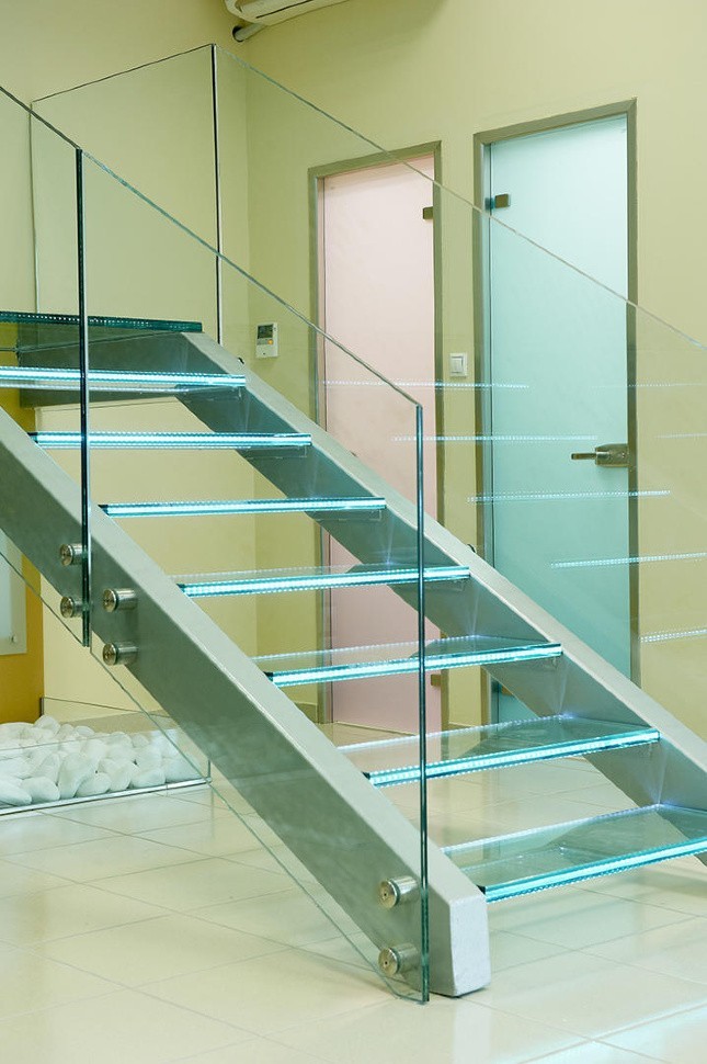 Стеклянные ступени на косоурной лестнице в доме в Самаре. Готовые проекты ПерилаГлавСнаб - фото 1