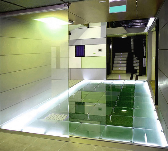 Стеклянное перекрытие из матового стекла на внутреннем балконе